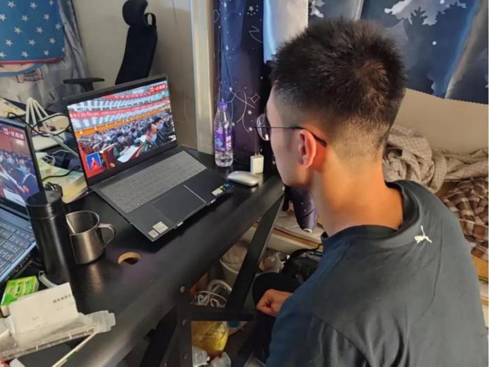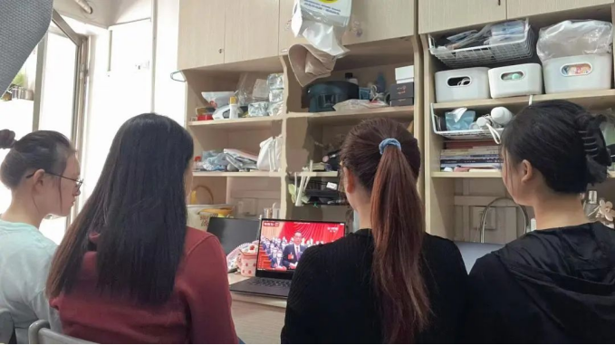 2022级员工举重运动发展中心黄芳与队友一起观看党的二十大直播