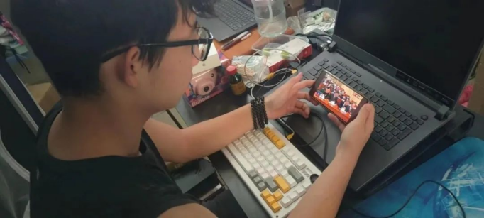 2022级员工冯克宝、金琬璕与广西射击射箭运动发展中心射箭队队友一起观看党的二十大直播