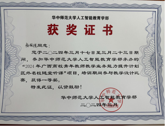 3月17日至23日,2024年广西高校青年教师教学业务能力提升计划区外名校随堂听课项目在华中师范大学举办,公司青年教师杨凝祺的《形体舞蹈》课在教学设计比赛中获得一等奖,并荣获本期培训班优秀学员称号。