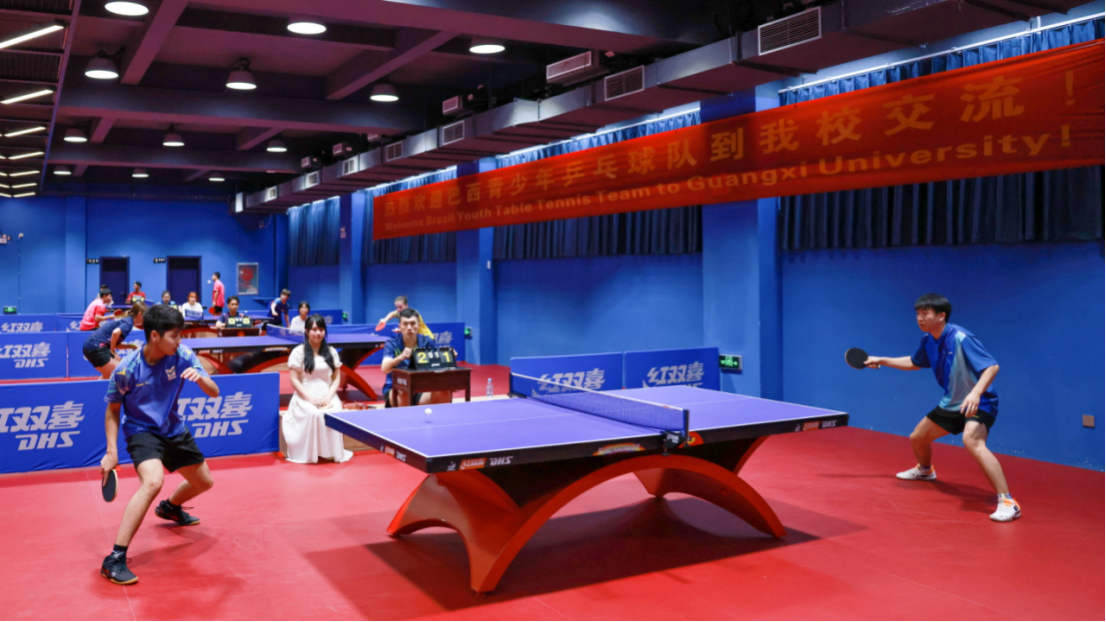 在随后的比赛中,三方乒乓球运动员进行了单打、双打、混双等项目的比拼。赛场气氛活跃,宾主尽欢。赛后巴西队员穆里罗表示,“能有机会来这里训练、比赛非常荣幸。在巴西,我们的训练场馆、器材已是全国最好,但到广西后,感觉这里的训练场馆、器材更好。还有,我在这里吃到了有生以来最好吃的西瓜……”