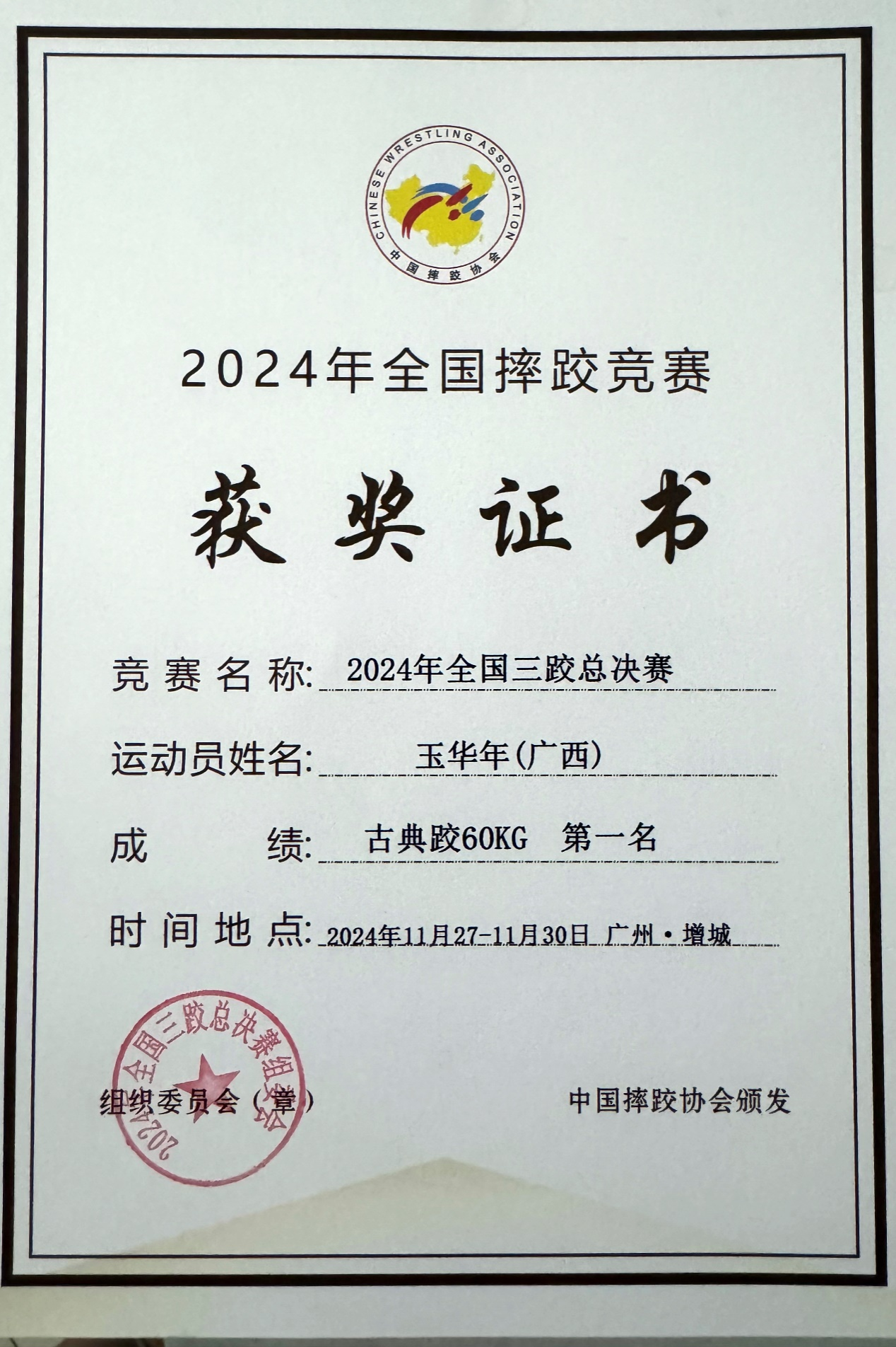 2024年11月27至30日,由国家体育总局举重摔跤柔道运动管理中心主办的2024年全国三跤总决赛在广州市增城区举行,公司2023级本科生玉华年、2024级研究生何飞鸿代表广西摔跤队出战,分别夺得60KG级、63KG级冠军,为广西争得荣誉。