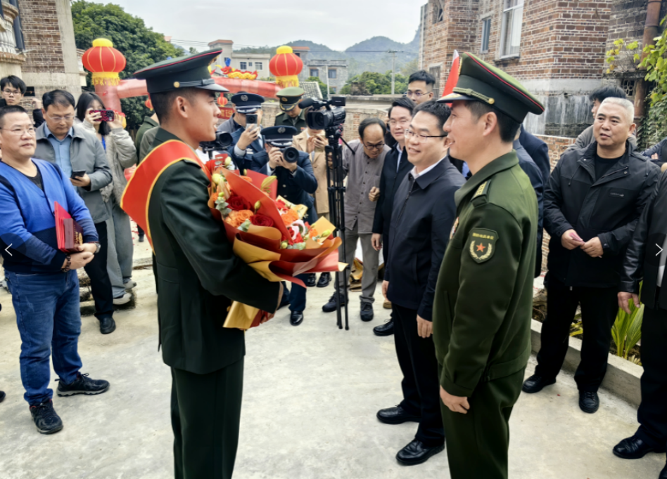 2025年1月15日,广西兴业县沉浸在一片喜庆的氛围之中,玉林市为一等功臣覃文旭家庭送立功喜报仪式在兴业县城隍镇龙潭村举行,龙潭村锣鼓喧天、鞭炮齐鸣,热闹非凡,在众多邻里乡亲的见证下,军地“送立功喜报团”将“一等功臣之家”牌匾送到覃文旭家中。