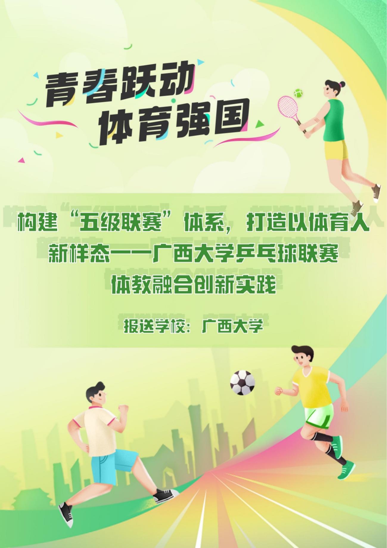 由教育部体育卫生与艺术教育司、教育部全国高等公司体育教学指导委员会指导,教育部宣传教育中心主办,北京体育大学、中国地质大学(北京)与“人民网+”客户端共同承办的“青春跃动 体育强国”高校体育风采视频和典型案例征集展示活动近日公布评选结果,教育部在全国各省区市选送的275件视频作品、152件典型案例作品中遴选出100个视频作品及50个典型案例,并于9月10日起在“人民网+”客户端、人民日报少年客户端集中展示。我院推送的《DB视讯啦啦操文化》视频作品和《构建“五级联赛”体系,打造以体育人新样态——DB视讯乒乓球联赛体教融合创新实践》典型案例作品双双入围,可喜可贺!