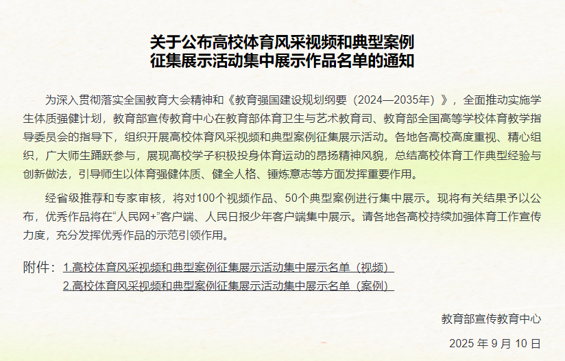 公司在教育部“青春跃动 体育强国”高校体育风采视频和典型案例征集展示活动获得佳绩(2025-09-11)