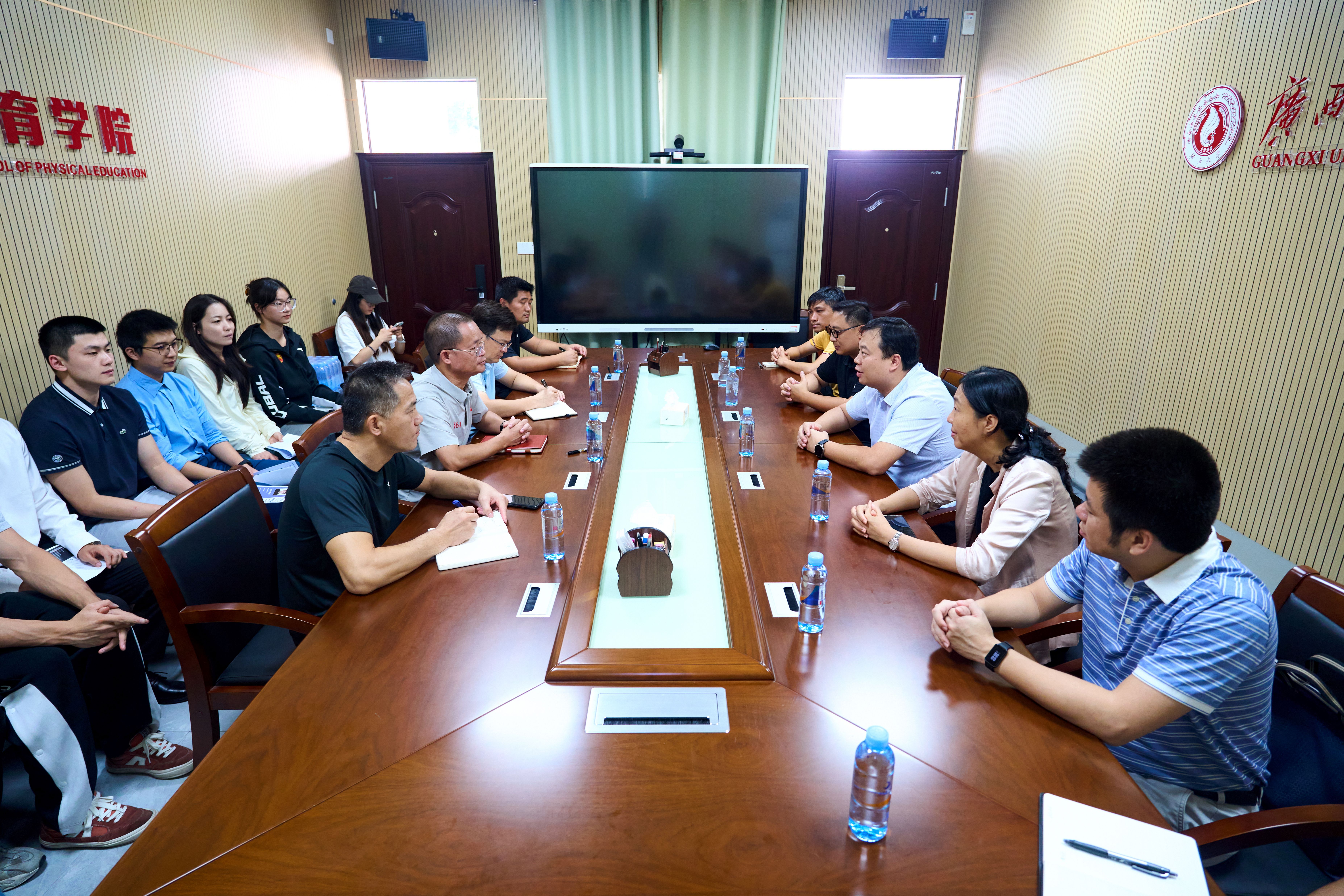 2025年10月16日,广西国控资本运营集团有限责任公司人力资源部部长林国超一行到公司调研,公司党委书记覃安基率领公司领导班子全体成员及部分师生代表热情迎接了林国超一行,宾主双方在公司二楼会议室召开座谈会,就人才培养、高水平运动员输送等议题开展深入交流,并于会后现场观看了篮球队、足球队等队伍训练情况。
