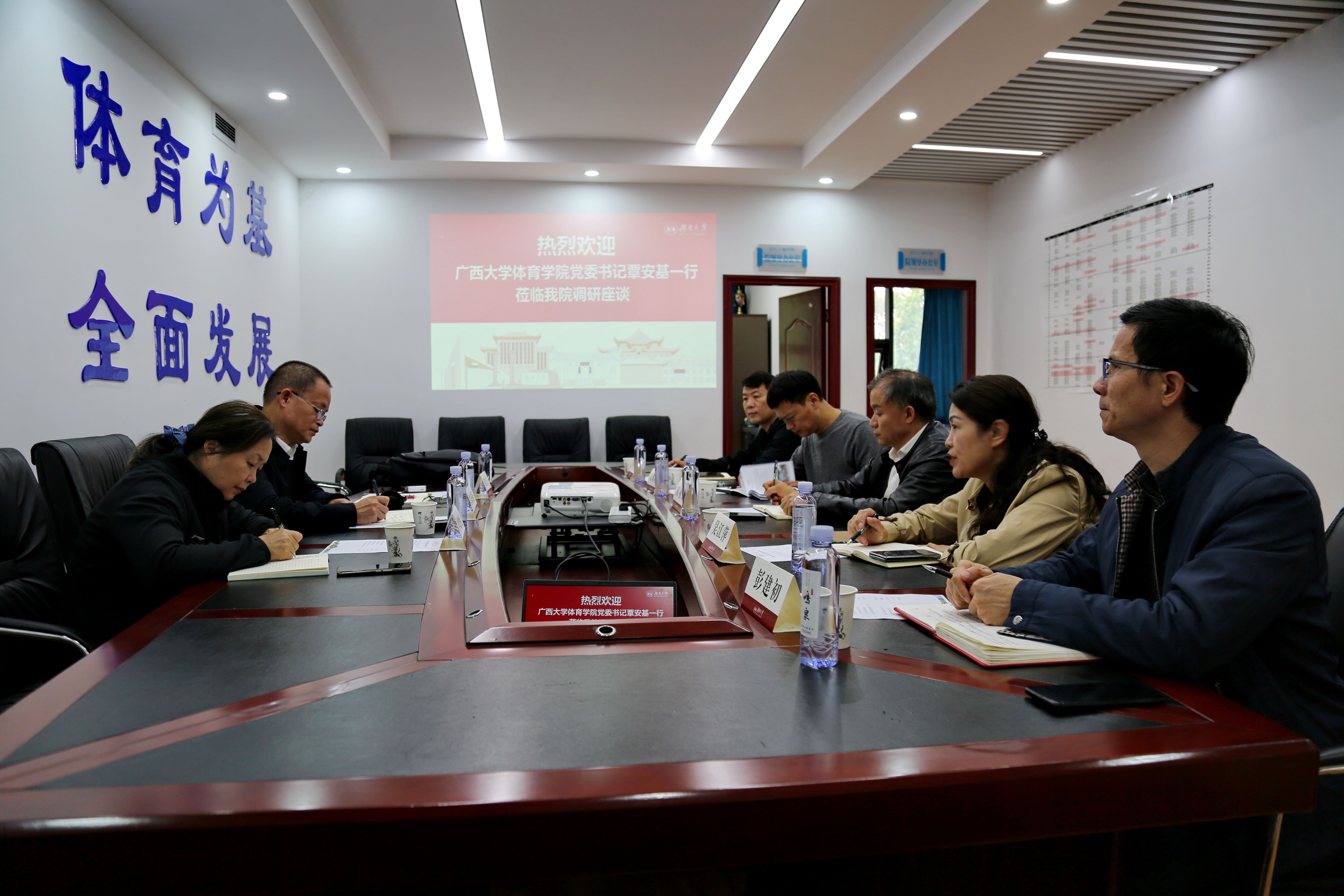 覃安基认为,湖南大学作为老牌重点大学、教育部直属“985”高校、“双一流”高校,办学历史悠久、办学水平高,是学习的好榜样。湖大体院办学理念先进,在公体课教学、体育场馆管理、群众体育工作、服务公司体育育人等方面积累了许多富有特色、值得借鉴的成果和经验,充分展现了湖大“千年学府、百年名校”的底蕴,给调研组留下深刻印象。覃安基还特别提到,今年1月,田祖国教授还亲赴西大体院指导科研和团队建设,产生良好效果,对此深表感谢。他衷心祝愿湖大同行越来越好,未来希望得到湖大同行更多的支持与帮助。